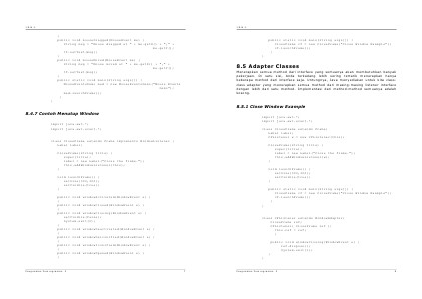 Menerapkan semua method dari interface yang semuanya akan membutuhkan banyak pekerjaan. Di satu sisi, Anda terkadang lebih sering tertarik menerapkan hanya beberapa method dari interface saja. Untungnya, Java menyediakan untuk kita classclass adapter yang menerapkan semua method dari masing-masing listener interface dengan lebih dari satu method. Implementasi dari method-method semuanya adalah kosong.
