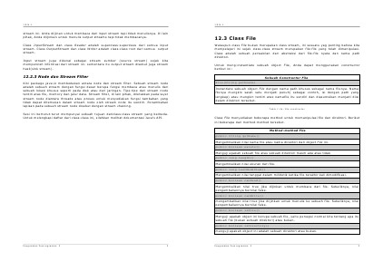 Mengembalikan nilai nama file atau nama direktori dari object File ini. public boolean exists() Menguji apakah sebuah file atau sebuah direktori masih ada atau tidak public long length() Mengembalikan nilai ukuran dari file. public long lastModified() Mengembalikan nilai tanggal dalam milidetik ketika file terakhir kali dimodifikasi. public boolean canRead()