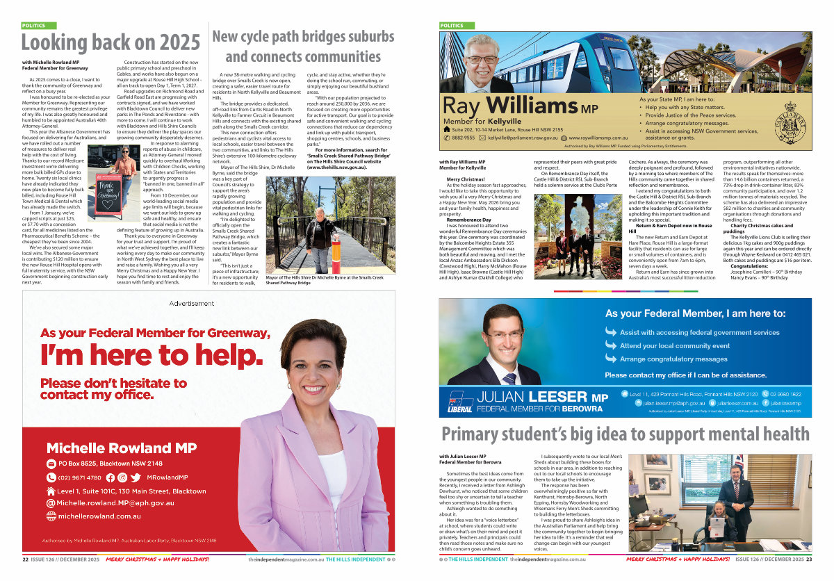 22 ISSUE 126 // DECEMBER 2025 MERRY CHRISTMAS & HAPPY HOLIDAYS! theindependentmagazine. com. au THE HILLS INDEPENDENT