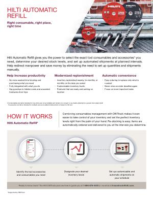 Hilti Automatic Refill gives you the power to select the exact tool consumables and accessories * you need , determine your desired stock levels , and set up automated shipments at planned intervals . Help redirect manpower and save money by eliminating the need to set up quantities and shipments manually .