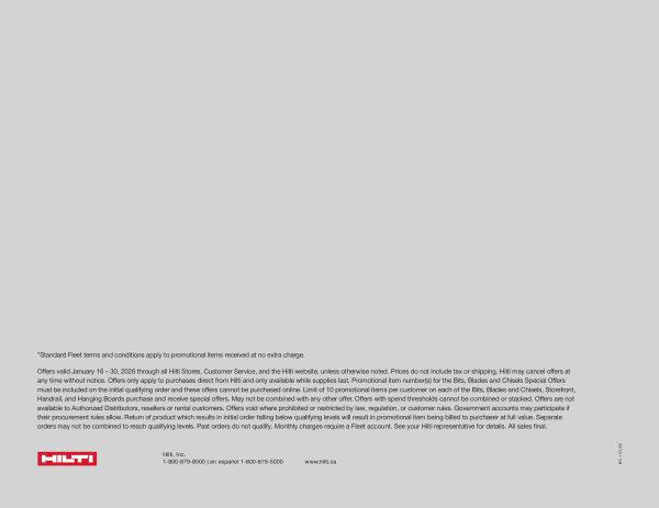 Offers valid January 16 – 30, 2026 through all Hilti Stores, Customer Service, and the Hilti website, unless otherwise noted. Prices do not include tax or shipping. Hilti may cancel offers at any time without notice. Offers only apply to purchases direct from Hilti and only available while supplies last. Promotional item number( s) for the Bits, Blades and Chisels Special Offers must be included on the initial qualifying order and these offers cannot be purchased online. Limit of 10 promotional items per customer on each of the Bits, Blades and Chisels, Storefront, Handrail, and Hanging Boards purchase and receive special offers. May not be combined with any other offer. Offers with spend thresholds cannot be combined or stacked. Offers are not available to Authorized Distributors, resellers or rental customers. Offers void where prohibited or restricted by law, regulation, or customer rules. Government accounts may participate if their procurement rules allow. Return of product which results in initial order falling below qualifying levels will result in promotional item being billed to purchaser at full value. Separate orders may not be combined to reach qualifying levels. Past orders do not qualify. Monthly charges require a Fleet account. See your Hilti representative for details. All sales final.
