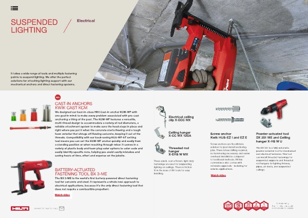 It takes a wide range of tools and multiple fastening points to suspend lighting. We offer the perfect solutions for attaching lighting support with our mechanical anchors and direct fastening systems.