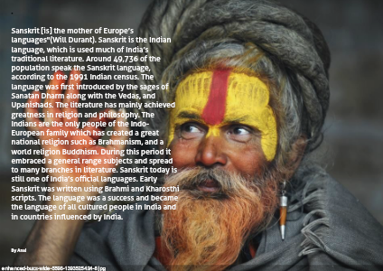Sanskrit [is] the mother of Europe’s languages"(Will Durant). Sanskrit is the Indian language, which is used much of India’s traditional literature. Around 49,736 of the population speak the Sanskrit language, according to the 1991 Indian census. The language was first introduced by the sages of Sanatan Dharm along with the Vedas, and Upanishads. The literature has mainly achieved greatness in religion and philosophy. The Indians are the only people of the Indo-European family which has created a great national religion such as Brahmanism, and a world religion Buddhism. During this period it embraced a general range subjects and spread to many branches in literature. Sanskrit today is still one of India’s official languages. Early Sanskrit was written using Brahmi and Kharosthi scripts. The language was a success and became the language of all cultured people in India and in countries influenced by India.