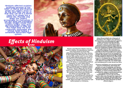 Hinduism affected societies positively because of the belief of Karma and Dharma, where the citizens strive to be the best they can be so that they can be in a better caste or to simply live a better life. This not only keeps the citizens accountable for themselves, it can also keep the population morally straight incase their political leaders stray from the moral path in their job. This helps keep the local community reasonable and ethical, while having a somewhat democratic legal system.
