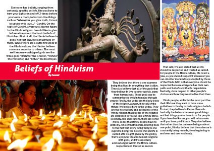 Everyone has beliefs, ranging from curiously specific beliefs, like you have to turn your lights on and off 3 times before you leave a room, to bottom line things such as “Whenever you give truth, it must be given with love…” -Gandhi. On the topic of Gandhi, a very well known figure in the Hindu religion. I would like to give information about the basic beliefs of Hinduism. First of all, the Hindu believe in gods, not just one, but a multitude of them. While there are a quite few gods in the Hindu culture, the Hindus believe some are superior to others. The most well known worshipped gods are the three gods “Brahma” the Creator, “Vishnu” the Protector, and “Shiva” the Destroyer.