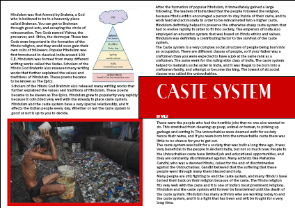 Scholars of the Hindu God Brahmin also released many writing works that further explained the values and traditions of Hinduism. These poems became to be known as The Epics. Hinduism grew in popularity very rapidly because it coincided very well with the already in place caste system. Hinduism and the caste system have a very special relationship, and it affects the Indian people every day. Whether or not the caste system is good or not is up to you to decide.