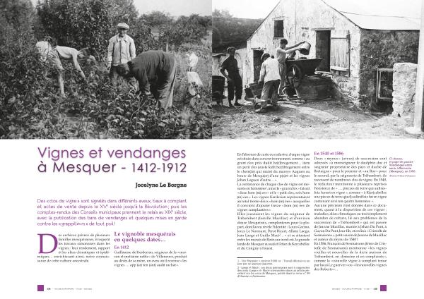 En l ’ absence de carte ou cadastre , chaque vigne est située dans son environnement , comme « au grant clox près dudit he ( r ) bregement … item un petit clox jouste ledit he ( r ) bregement entre le chem ( in ) qui maint du maroys Auguen au bourc de Mesqu ( er ) d ’ une p ( a ) rt et les vignes Jehan Leguen d ’ autre … ». La contenance de chaque clos de vigne est mesurée en hommées 1 , ainsi le « grant clox » faisait « doze hom ( m ) ees » et le « petit clox , seix hom ( m ) ees ». Les vignes Kerderian représentaient au total trente-deux « hom ( m ) ées » auxquelles il convient d ’ ajouter treize « hom ( m ) ées de vignes complantées ». Elles jouxtaient les vignes du seigneur de Tréhembert ( famille Muzillac ) et d ’ environ douze Mesquérais , complanteurs pour la plupart , dont l ’ aveu révèle l ’ identité : Louis Garino , Joces Le Normant , Perot Ricart , Allain Laego , Jean Laego et Guillo Macé 2 … » et se situaient entre les marais de Rostu au nord-est , la grande lande de Mesquer au sud et l ’ étier de Kercabellec et du Conguy à l ’ ouest .