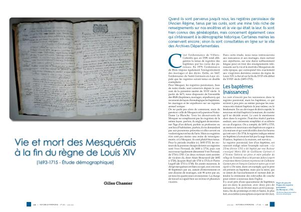 Dans cette étude , nous nous intéresserons aux naissances et aux mariages , mais surtout aux sépultures , sur une durée suffisamment longue pour en tirer des enseignements intéressants sur la vie et la mort des Mesquérais de cette époque , qui correspond très exactement aux vingt-trois dernières années du règne de Louis XIV , à cheval sur la fin du XVII e et le début du XVIII e siècle ( 1693-1715 ).