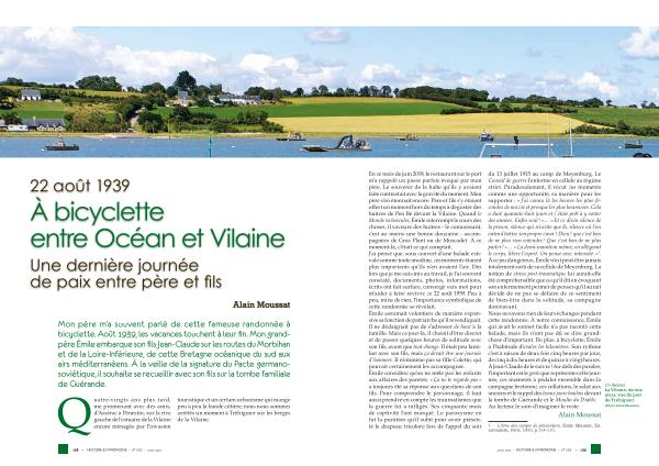 En ce mois de juin 2019 , le restaurant sur le port m ’ a rappelé un passé parfois évoqué par mon père . Le souvenir de la halte qu ’ ils y avaient faite contrastait avec la gravité du moment . Mon père s ’ en étonnait encore . Père et fils s ’ y étaient offert un moment hors du temps à déguster des huitres de Pen Bé devant la Vilaine . Quand le Monde va basculer , Émile interrompt le cours des choses , il savoure des huitres - le connaissant , c ’ est au moins une bonne douzaine - accompagnées de Gros Plant ou de Muscadet . À ce moment-là , c ’ était ce qui comptait . J ’ ai pensé que , sous couvert d ’ une balade estivale somme toute anodine , ces moments étaient plus importants qu ’ ils n ’ en avaient l ’ air . Dès lors que je me suis mis au travail , je l ’ ai souvent constaté , documents , photos , informations , écrits ont fait surface , convergé vers moi pour m ’ aider à faire revivre ce 22 août 1939 . Peu à peu , mine de rien , l ’ importance symbolique de cette randonnée se révélait . Émile assumait volontiers de manière expansive sa fonction de patriarche qu ’ il revendiquait . Il ne dédaignait pas de s ’ adresser de haut à la famille . Mais ce jour-là , il choisit d ’ être discret et de passer quelques heures de solitude avec son fils , avant que tout change . Il était peu familier avec son fils , mais ça devait être une journée d ’ hommes . Il n ’ emmène pas sa fille Colette , qui pouvait certainement les accompagner . Émile considère qu ’ on ne mêle pas les enfants aux affaires des parents . « Ça ne te regarde pas » a toujours été sa réponse aux questions de son fils . Pour comprendre le personnage , il faut aussi prendre en compte les traumatismes que la guerre lui a infligés . Ses cinquante mois de captivité l ’ ont marqué . Le paroxysme en fut la punition qu ’ il subit pour avoir présenté le drapeau tricolore lors de l ’ appel du soir du 13 juillet 1915 au camp de Meyenburg . Le Conseil de guerre l ’ enferme en cellule au régime strict . Paradoxalement , il vécut ces moments comme une opportunité , sa manière pour les supporter : « J ’ ai connu là les heures les plus fécondes de ma vie et presque les plus heureuses . Cela a duré quarante-huit jours et j ’ étais prêt à y rester des années . Enfin seul ! »… « Et ce divin silence de la prison , silence qui n ’ existe que là , silence où l ’ on entend battre son propre cœur ! Dieu ! que c ’ est bon de ne plus rien entendre ! Que c ’ est bon de ne plus parler ! »… « La demi-inanition même , en allégeant le corps , libère l ’ esprit . On pense avec intensité . » 1 . À ce jeu dangereux , Émile n ’ est peut-être jamais totalement sorti de sa cellule de Meyenburg . La notion de stress post-traumatique lui aurait-elle été compréhensible que ce qu ’ il dit en évoquant son enfermement permet de penser qu ’ il aurait décidé de ne pas se défaire de ce sentiment de bien-être dans la solitude , sa compagne dorénavant . Nous ne savons rien de leurs échanges pendant cette randonnée . À notre connaissance , Émile qui avait le sonnet facile n ’ a pas raconté cette balade , mais ils n ’ ont pas dû se dire grandchose d ’ important . De plus , à bicyclette , Émile a l ’ habitude d ’ avaler les kilomètres . Son rythme c ’ est à raison de deux fois cinq heures par jour , de cinq à dix heures et de quinze à vingt heures . À Jean-Claude de le suivre ! Au-delà des paroles , l ’ important est le geste que représente cette journée , ces moments à pédaler ensemble dans la campagne bretonne , ces collations , le salut aux anciens et le rappel des beaux jours baulois devant la tombe de Guérande et le Moulin du Diable . Au lecteur le soin d ’ imaginer le reste .