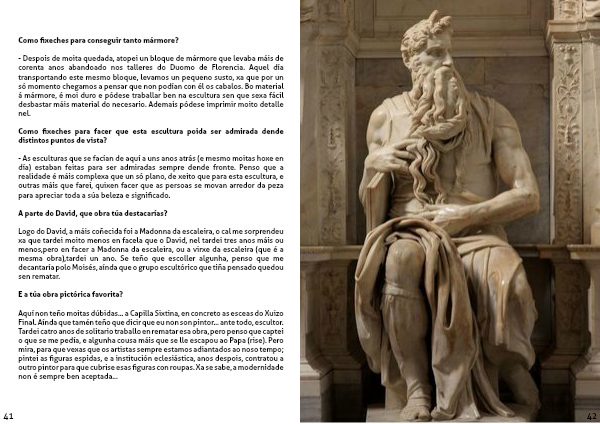 Tardei catro anos de solitario traballo en rematar esa obra, pero penso que captei o que se me pedía, e algunha cousa máis que se lle escapou ao Papa (rise). Pero mira, para que vexas que os artistas sempre estamos adiantados ao noso tempo; pintei as figuras espidas, e a institución eclesiástica, anos despois, contratou a outro pintor para que cubrise esas figuras con roupas. Xa se sabe, a modernidade non é sempre ben aceptada...