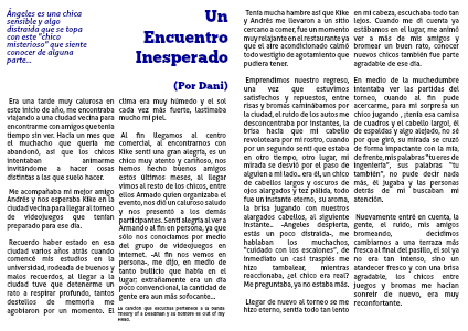 Llegar de nuevo al torneo se me hizo eterno, sentía todo tan lento en mi cabeza, escuchaba todo tan lejos. Cuando me di cuenta ya estábamos en el lugar, me animó ver a más de mis amigos y bromear un buen rato, conocer nuevos chicos también fue parte agradable de ese día.