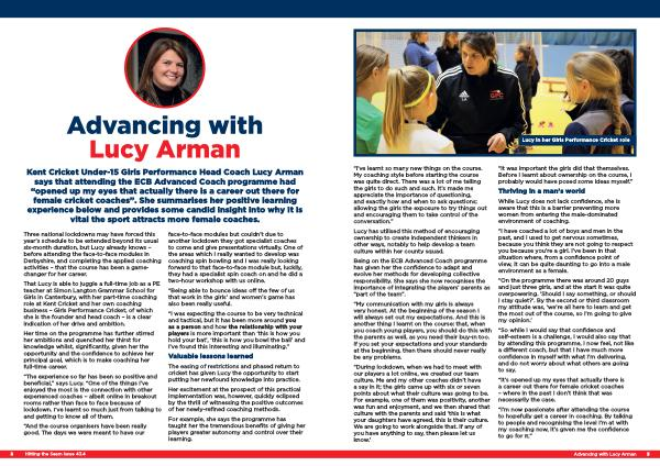 Kent Cricket Under-15 Girls Performance Head Coach Lucy Arman says that attending the ECB Advanced Coach programme had “ opened up my eyes that actually there is a career out there for female cricket coaches ”. She summarises her positive learning experience below and provides some candid insight into why it is vital the sport attracts more female coaches .