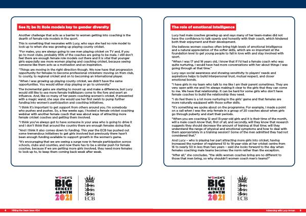 “ For males , you are always going to see men playing cricket on TV and , if you go to most clubs , probably 95 % of the coaches are going to be male . I still don ’ t feel there are enough female role models out there and it is vital that younger girls especially see more women playing and coaching cricket , because seeing someone like them acts as a motivation and an inspiration .