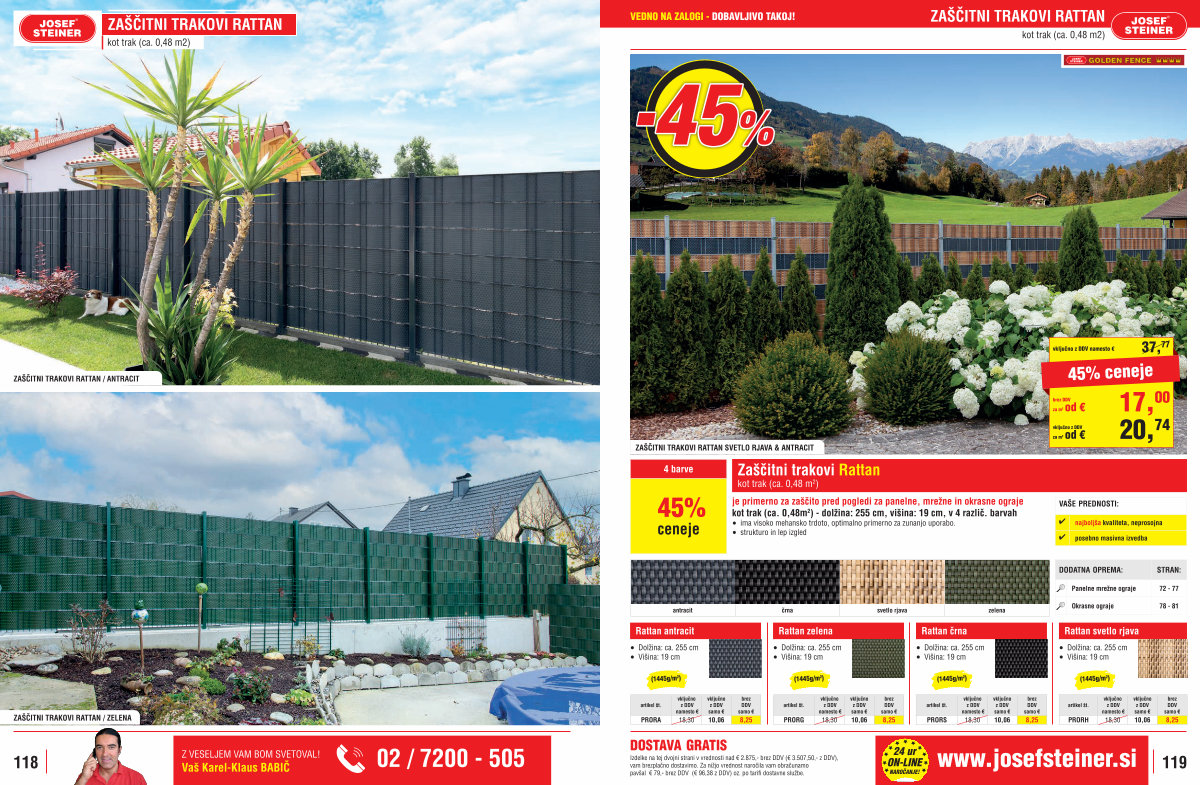 je primerno za zaščito pred pogledi za panelne, mrežne in okrasne ograje kot trak( ca. 0,48m 2)- dolžina: 255 cm, višina: 19 cm, v 4 različ. barvah
