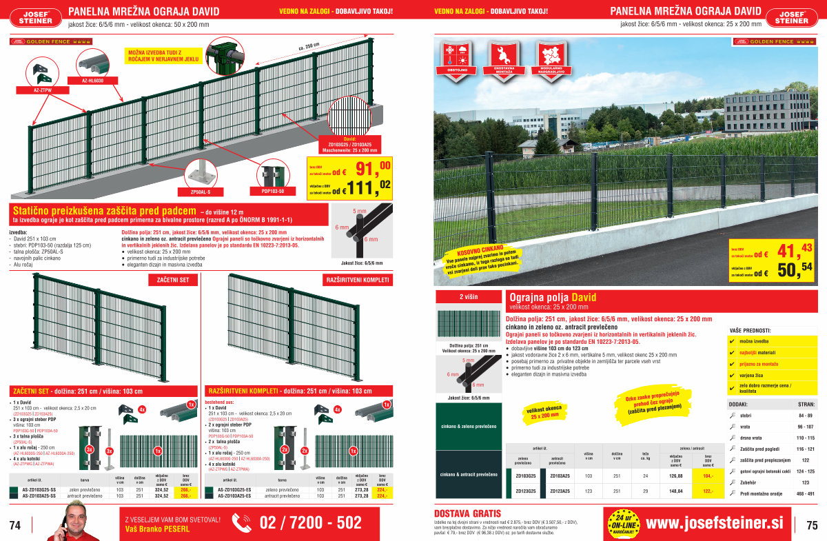 Dolžina polja: 251 cm, jakost žice: 6 / 5 / 6 mm, velikost okenca: 25 x 200 mm cinkano in zeleno oz. antracit prevlečeno Ograjni paneli so točkovno zvarjeni iz horizontalnih in vertikalnih jeklenih žic. Izdelava panelov je po standardu EN 10223-7:2013-05.