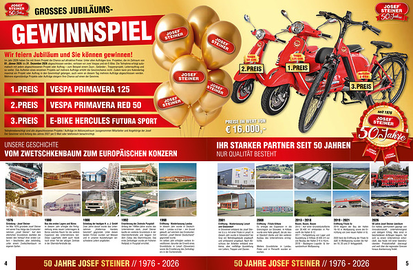 Eröffnung- Niederlassung Landau In diesem Jahr wurde in Deutschland – Landau a. d. Isar – ein Grund gekauft, auf welchem das Einzelunternehmen „ Josef Steiner Deutschland“ gegründet wurde. Im selben Jahr erfolgten weitere Investitionen, darunter der Erwerb eines Grundstücks in Lenart( Slowenien) sowie die Erweiterung des Zentrallagers in der Eschenstraße.