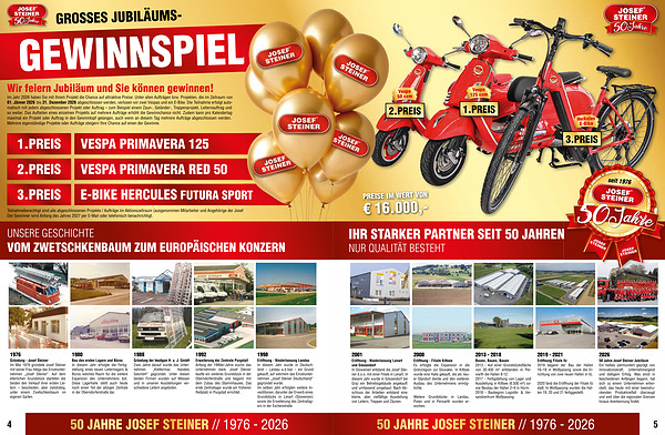 Eröffnung- Niederlassung Landau In diesem Jahr wurde in Deutschland – Landau a. d. Isar – ein Grund gekauft, auf welchem das Einzelunternehmen „ Josef Steiner Deutschland“ gegründet wurde. Im selben Jahr erfolgten weitere Investitionen, darunter der Erwerb eines Grundstücks in Lenart( Slowenien) sowie die Erweiterung des Zentrallagers in der Eschenstraße.