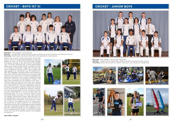 Gillette Cup success continued through to the 2021 season . The 1st XI cricket team defended a small total against St John ’ s 1st XI for the second year straight to progress through to the semi-final of the Gillette Cup . The home semi-final was a hard fought battle where even Logan Ryniker-Doull ’ s quickfire 100 was not enough to overcome a large first innings total set by Lindisfarne College . Within the 2A grade , the side regularly set high totals over 150 batting first , with Tom Gallagher and Ryan Miller each picking up three 50 ’ s , and Cole Grant-Smith also scoring a half century . Out in the field , our bowlers challenged the opposition batsmen , with Cooper Dunkerley being the pick of the bunch , accumulating 12 wickets . The team were competitive in the majority of all Term 1 matches within the division and were very unlucky not to be rewarded with wins as a result of our efforts more often than not . The two competition wins for the team came against Marewa Cricket Club , winning by 97 and 49 runs in respective matches . However , with the upcoming talent of junior cricketers evident by their performances in 1st XI fixtures , there are promising signs for 1st XI Cricket at HNHS for the upcoming season and years to come . Team training has already returned with coach Geoff Morrison set on solidifying the sides position in the 2A division of the Hawke ’ s Bay competition , which returns in week two of Term 4 . On behalf of the 1st XI cricket boys , we would like to thank Geoff for his commitment , hard work and time he has dedicated towards making our team competitive against other regional 1st XI ’ s with the limited resources he has available to him . We also appreciated his ability to introduce talented juniors into the 1st XI training squad to be available for selection .