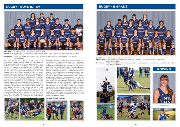The boys 1st XV rugby team played a season of passion , excitement , victory , defeat , and brotherhood . The team was built up of many young players and a few older , more experienced players . Everyone brought a different set of skills to the team and , with the experience of the more senior players , the younger players were able to grow into better players and even taught the oldest players a thing or two . The team experienced many injuries in the first few games of the season , bringing the squad of 28 down to 22 and then further on in the season down to 18 . Everyone , regardless of injury , supported and gave the team their time , experience and mana . The 18 left at the end of the season played with passion and love of the game until the end . Our first game saw us take a loss to Wairoa College , a team we would eventually beat when we met again . The rest of the season saw us win over William Colenso , Hastings Boys 3rd XV , Napier Boys u15 , Napier Boys 3rd XV , and Wairoa College 1st XV . The boys all played with a passion and fire that came with genuinely enjoying the game regardless of the score and the result . The teamwork and brotherhood shown by all the boys were incredible and made you really love schoolboy rugby , irrespective of the grade or year level . We played five competition games and three preseason games and we finished the season with three competition wins and two losses . Despite being knocked out in the semi-finals , we still finished second based on points in our competition . Rugby at Havelock North High School has been improving year by year , and I can ’ t wait to see how they perform in the future with the new players coming through the school and a profound interest in a game that brings people together . I have thoroughly enjoyed the past four years playing rugby for the school . We have struggled with numbers and finding new players , but the mana and the culture built up by the players is what has set us up for the successes that we have achieved . All this would , without a doubt , could not have been accomplished without the time and effort put in by the players , coaches , parents , and teachers . I wish all the boys the best of luck in the future and with their future pathways , and I hope that they never forget the game of rugby .