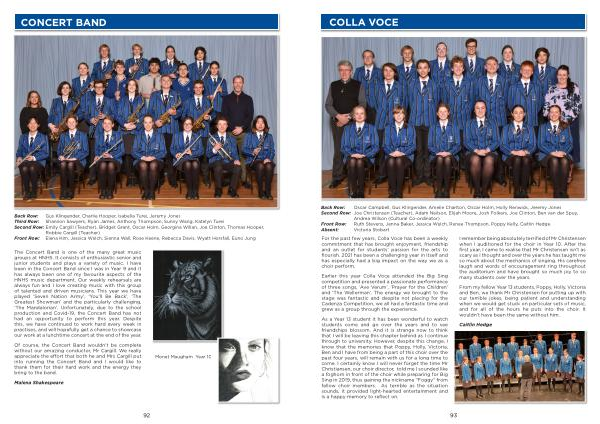 The Concert Band is one of the many great music groups at HNHS . It consists of enthusiastic senior and junior students and plays a variety of music . I have been in the Concert Band since I was in Year 9 and it has always been one of my favourite aspects of the HNHS music department . Our weekly rehearsals are always fun and I love creating music with this group of talented and driven musicians . This year we have played ‘ Seven Nation Army ’, ‘ You ’ ll Be Back ’, ‘ The Greatest Showman ’ and the particularly challenging , ‘ The Mandalorian ’. Unfortunately , due to the school production and Covid-19 , the Concert Band has not had an opportunity to perform this year . Despite this , we have continued to work hard every week in practises , and will hopefully get a chance to showcase our work at a lunchtime concert at the end of the year .
