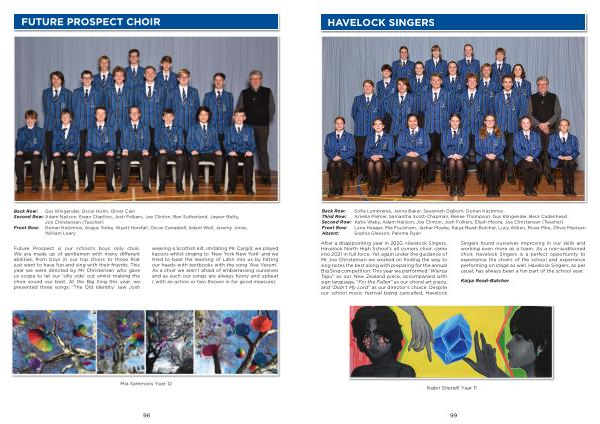 Future Prospect is our school ’ s boys only choir . We are made up of gentlemen with many different abilities , from boys in our top choirs to those that just want to have fun and sing with their friends . This year we were directed by Mr Christensen who gave us scope to let our ‘ silly side ’ out whilst making the choir sound our best . At the Big Sing this year , we presented three songs : ‘ The Old Identity ’ saw Josh wearing a Scottish kilt , imitating Mr . Cargill ; we played kazoos whilst singing to ‘ New York New York ’ and we tried to beat the learning of Latin into us by hitting our heads with textbooks with the song ‘ Ave Verum ’. As a choir we aren ’ t afraid of embarrassing ourselves and as such our songs are always funny and upbeat ( with an action or two thrown in for good measure ).
