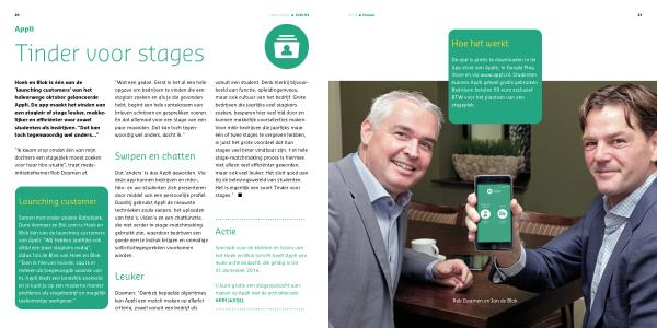 Daamen : " Dankzij bepaalde algoritmes kan Appli een match maken op allerlei criteria , zowel vanuit een bedrijf als vanuit een student . Denk hierbij bijvoorbeeld aan functie , opleidingsniveau , maar ook cultuur van het bedrijf . Grote bedrijven die jaarlijks veel stagiairs zoeken , besparen hier veel tijd door en kunnen makkelijk voorselecties maken . Voor mkb-bedrijven die jaarlijks maar één of twee stages te vergeven hebben , is juist het grote voordeel dat hun stages veel beter vindbaar zijn . Het hele stage-matchmaking proces is hiermee niet alleen veel efficiënter geworden , maar ook veel leuker . Het sluit goed aan bij de belevingswereld van studenten . Het is eigenlijk een soort Tinder voor stages ." ■