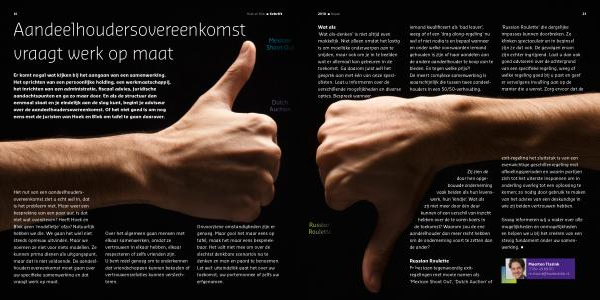Er komt nogal wat kijken bij het aangaan van een samenwerking . Het oprichten van een persoonlijke holding , een werkmaatschappij , het inrichten van een administratie , fiscaal advies , juridische aandachtspunten en ga zo maar door . En als de structuur dan eenmaal staat en je eindelijk aan de slag kunt , begint je adviseur over de aandeel houdersovereenkomst . Of het niet goed is om nog eens met de juristen van Hoek en Blok om tafel te gaan daarover .