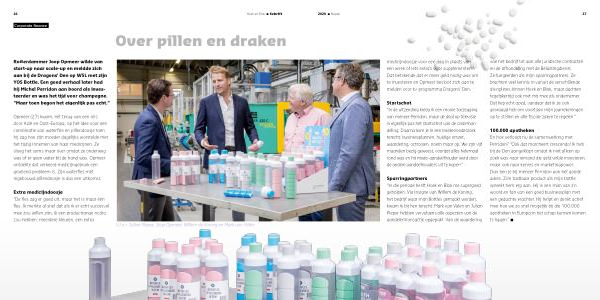100.000 apotheken En hoe verloopt nu de samenwerking met Perridon ? “ Ook dat marcheert crescendo ! Ik heb bij de Den aangeklopt omdat ik niet alleen op zoek was naar iemand die geld wilde investeren , maar ook naar kennis en marketingpower . Dan ben je bij meneer Perridon aan het goede adres . Zo ’ n tastbaar product als mijn bottle spreekt hem erg aan . Hij is een man van z ’ n woord en fan van een goed businessplan met een gedachte erachter . Hij helpt en denkt actief mee hoe we zo snel mogelijk bij die 100.000 apotheken in Europa in het schap kunnen komen te liggen .” ◼