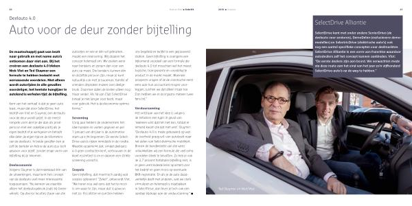 Verduurzaming Het ontstaan van het idee is volgens de initiators een typisch geval van ‘ iedereen wist dat het niet kon , totdat er iemand kwam die dat niet wist ’. Sluymer : “ Deelauto 4.0 is mede gebaseerd op wat de overheid graag wil : van autobezit naar het delen van liefst elektrische mobiliteit . Binnen de bandbreedte van die wens ontwikkelden wij een formule die veel extra voordelen bleek te bevatten . Zo heb je ook de 2,7 procent forfaitaire bijtelling niet , is er geen verminderde leencapaciteit voor het bedrijf en geen risico op eventuele BKR-registratie . En als je de auto daadwerkelijk deelt met anderen , wat we sterk stimuleren en helemaal is ingebakken in SelectDrive , dan lever je toch ook een aardige bijdrage aan de verduurzaming .” ◼