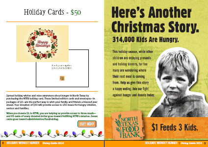 Spread holiday wishes and raise awareness about hunger in North Texas by purchasing the NTFB holiday card. These limited edition cards and envelopes--in packages of 10--are the perfect way to wish your family and friends a blessed year ahead. Your donation of $50 will provide access to 150 meals for hungry children, seniors and families.