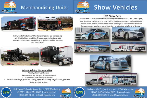 HWP Show Cars Hollywood’ s Productions offers exact replicas of the Miller Lite, Coors Light, and Keystone Light truck race cars. All units give consumers and retailers an up-close and personal look at the inner-workings of an authentic stock car. Consumers can also have complimentary photos taken in front of the cars!