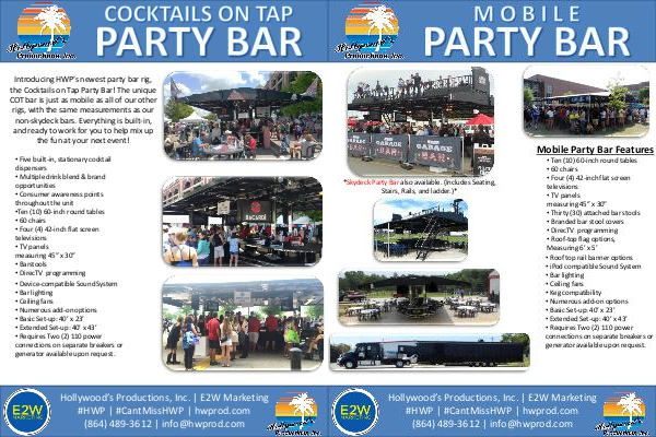 Introducing HWP’ s newest party bar rig, the Cocktails on Tap Party Bar! The unique COT bar is just as mobile as all of our other rigs, with the same measurements as our non-skydeck bars. Everything is built-in, and ready to work for you to help mix up the fun at your next event!