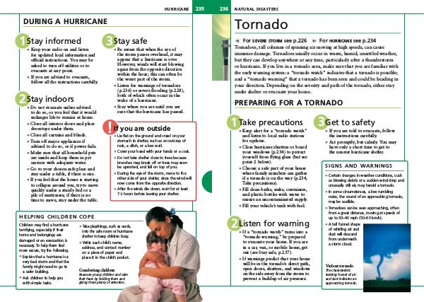 For SEVERE STORM see p. 226 For HURRICANE see p. 234 Tornadoes, tall columns of spinning air moving at high speeds, can cause immense damage. Tornadoes usually occur in warm, humid, unsettled weather, but they can develop anywhere at any time, particularly after a thunderstorm or hurricane. If you live in a tornado area, make sure that you are familiar with the early warning system: a“ tornado watch” indicates that a tornado is possible; and a“ tornado warning” that a tornado has been seen and could be heading in your direction. Depending on the severity and path of the tornado, either stay under shelter or evacuate your home.
