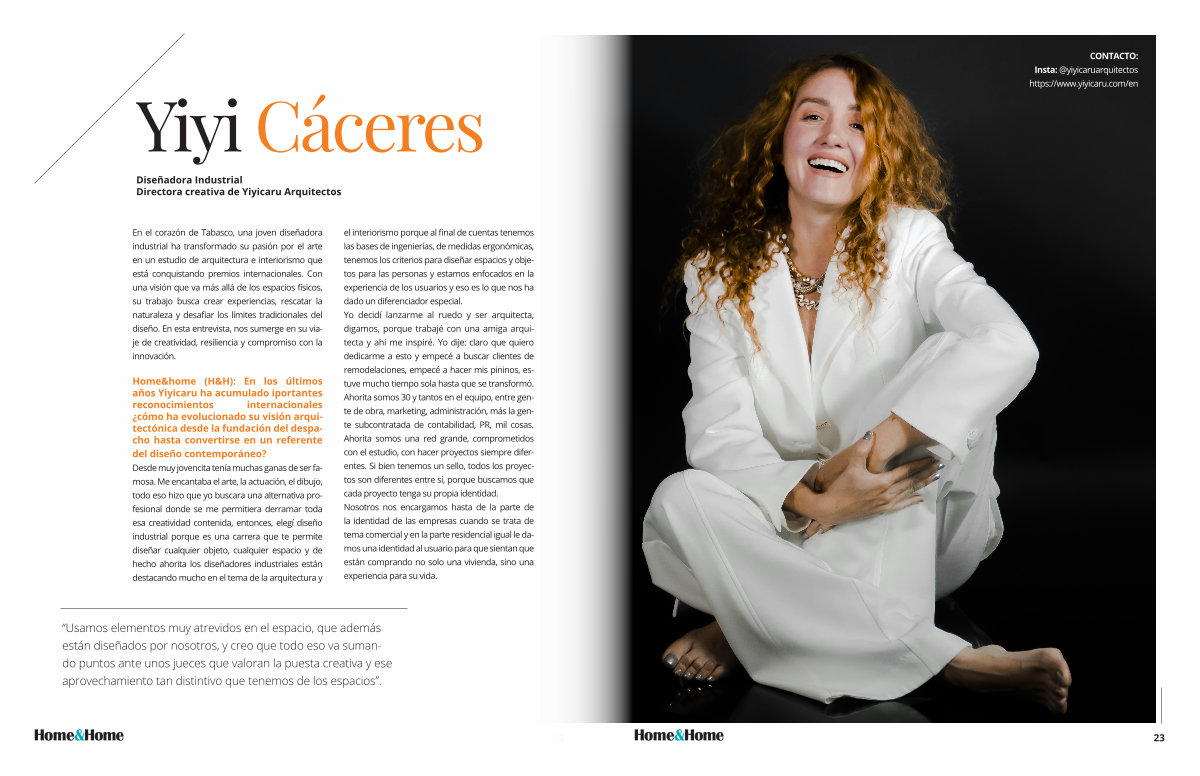 Home & home( H & H): En los últimos años Yiyicaru ha acumulado iportantes reconocimientos internacionales ¿ cómo ha evolucionado su visión arquitectónica desde la fundación del despacho hasta convertirse en un referente del diseño contemporáneo? Desde muy jovencita tenía muchas ganas de ser famosa. Me encantaba el arte, la actuación, el dibujo, todo eso hizo que yo buscara una alternativa profesional donde se me permitiera derramar toda esa creatividad contenida, entonces, elegí diseño industrial porque es una carrera que te permite diseñar cualquier objeto, cualquier espacio y de hecho ahorita los diseñadores industriales están destacando mucho en el tema de la arquitectura y el interiorismo porque al final de cuentas tenemos las bases de ingenierías, de medidas ergonómicas, tenemos los criterios para diseñar espacios y objetos para las personas y estamos enfocados en la experiencia de los usuarios y eso es lo que nos ha dado un diferenciador especial. Yo decidí lanzarme al ruedo y ser arquitecta, digamos, porque trabajé con una amiga arquitecta y ahí me inspiré. Yo dije: claro que quiero dedicarme a esto y empecé a buscar clientes de remodelaciones, empecé a hacer mis pininos, estuve mucho tiempo sola hasta que se transformó. Ahorita somos 30 y tantos en el equipo, entre gente de obra, marketing, administración, más la gente subcontratada de contabilidad, PR, mil cosas. Ahorita somos una red grande, comprometidos con el estudio, con hacer proyectos siempre diferentes. Si bien tenemos un sello, todos los proyectos son diferentes entre sí, porque buscamos que cada proyecto tenga su propia identidad. Nosotros nos encargamos hasta de la parte de la identidad de las empresas cuando se trata de tema comercial y en la parte residencial igual le damos una identidad al usuario para que sientan que están comprando no solo una vivienda, sino una experiencia para su vida.