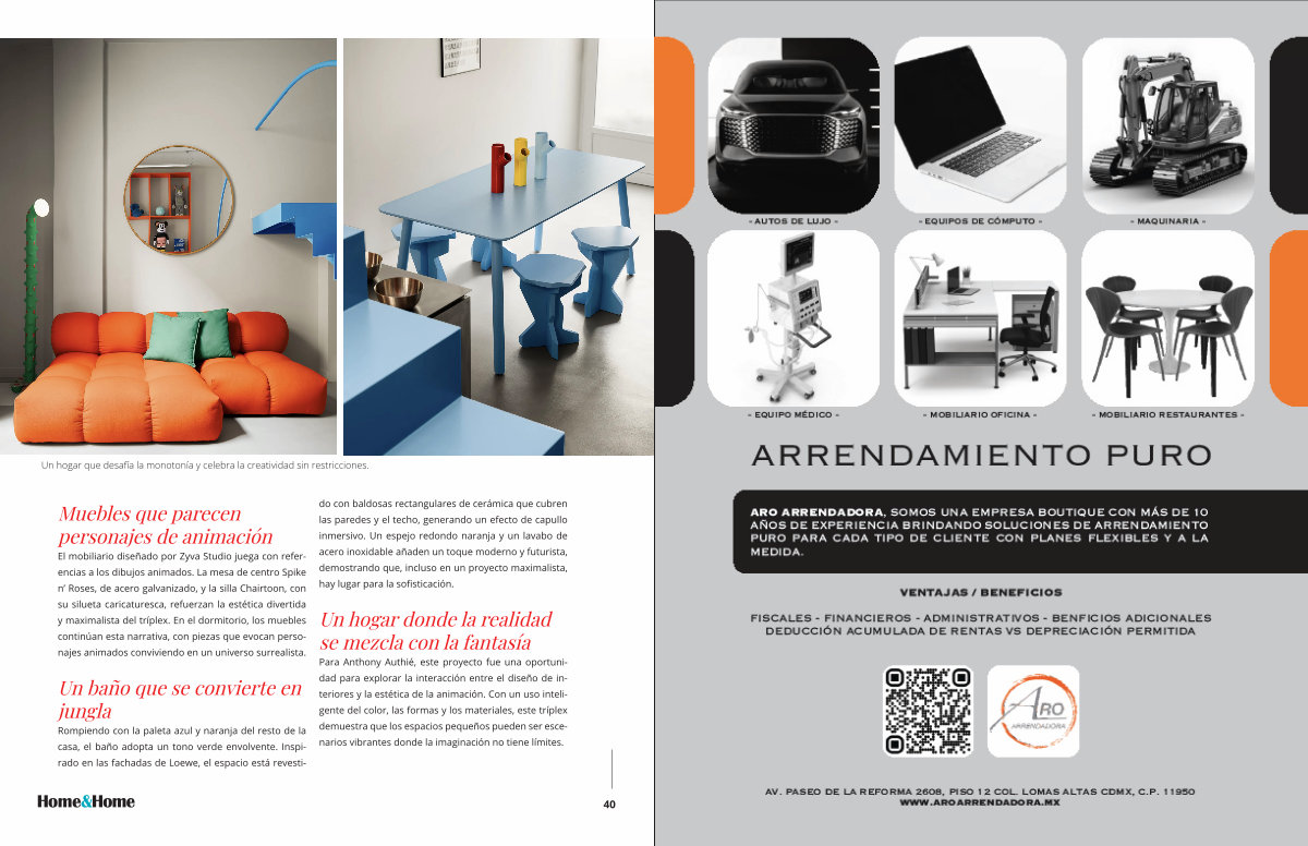 El mobiliario diseñado por Zyva Studio juega con referencias a los dibujos animados. La mesa de centro Spike n’ Roses, de acero galvanizado, y la silla Chairtoon, con su silueta caricaturesca, refuerzan la estética divertida y maximalista del tríplex. En el dormitorio, los muebles continúan esta narrativa, con piezas que evocan personajes animados conviviendo en un universo surrealista.