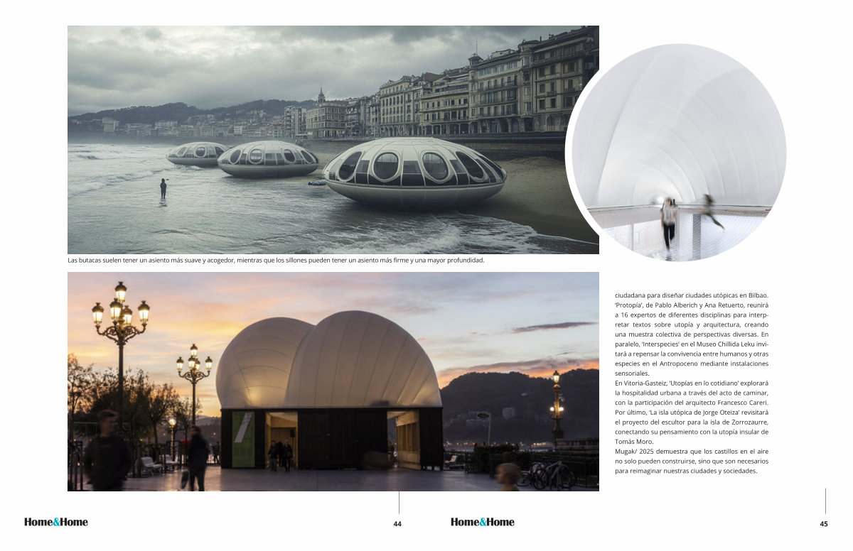 mayor profundidad. ciudadana para diseñar ciudades utópicas en Bilbao.‘ Protopía’, de Pablo Alberich y Ana Retuerto, reunirá a 16 expertos de diferentes disciplinas para interpretar textos sobre utopía y arquitectura, creando una muestra colectiva de perspectivas diversas. En paralelo,‘ Interspecies’ en el Museo Chillida Leku invitará a repensar la convivencia entre humanos y otras especies en el Antropoceno mediante instalaciones sensoriales. En Vitoria-Gasteiz,‘ Utopías en lo cotidiano’ explorará la hospitalidad urbana a través del acto de caminar, con la participación del arquitecto Francesco Careri. Por último,‘ La isla utópica de Jorge Oteiza’ revisitará el proyecto del escultor para la isla de Zorrozaurre, conectando su pensamiento con la utopía insular de Tomás Moro. Mugak / 2025 demuestra que los castillos en el aire no solo pueden construirse, sino que son necesarios para reimaginar nuestras ciudades y sociedades.