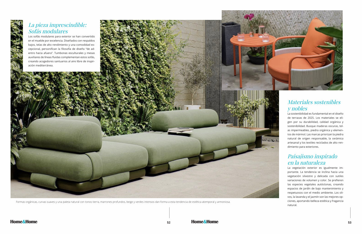 La sostenibilidad es fundamental en el diseño de terrazas de 2025. Los materiales se eligen por su durabilidad, calidad orgánica y sostenibilidad. Busque maderas oscuras, telas impermeables, piedra orgánica y elementos de mármol. Las marcas priorizan la piedra natural de origen responsable, la cerámica artesanal y los textiles reciclados de alto rendimiento para exteriores. encia de estética atemporal y armoniosa.