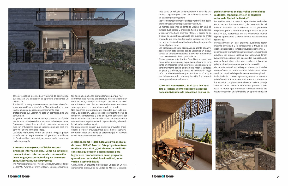 3. Home & Home( H & H): Casa Ailes y la medalla de oro en FRAME Awards: Este proyecto obtuvo Gold Medal en 2025. ¿ Qué elementos de diseño considera que fueron determinantes para lograr este reconocimiento en un programa que valora creatividad, funcionalidad, innovación y sostenibilidad? Casa Ailes es un proyecto muy especial. Ubicada en un fraccionamiento exclusivo de la Ciudad de México, la concebi-