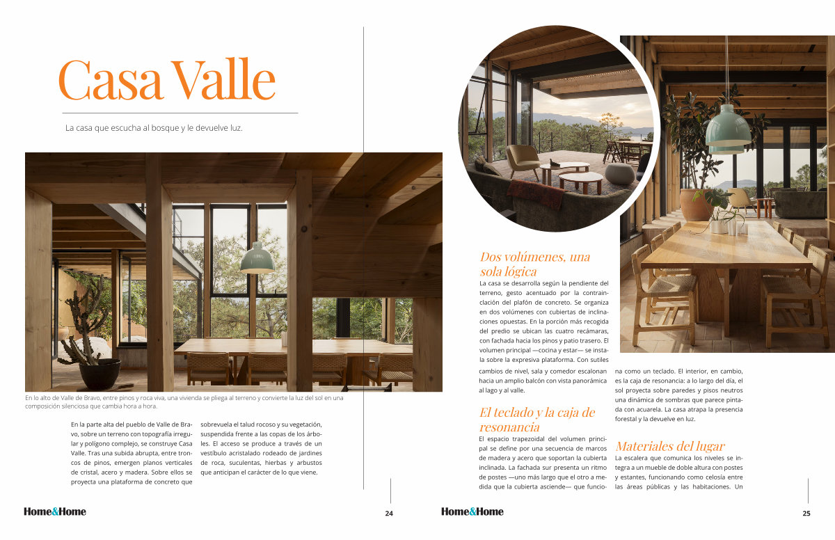 La casa se desarrolla según la pendiente del terreno, gesto acentuado por la contrainclación del plafón de concreto. Se organiza en dos volúmenes con cubiertas de inclinaciones opuestas. En la porción más recogida del predio se ubican las cuatro recámaras, con fachada hacia los pinos y patio trasero. El volumen principal— cocina y estar— se instala sobre la expresiva plataforma. Con sutiles
