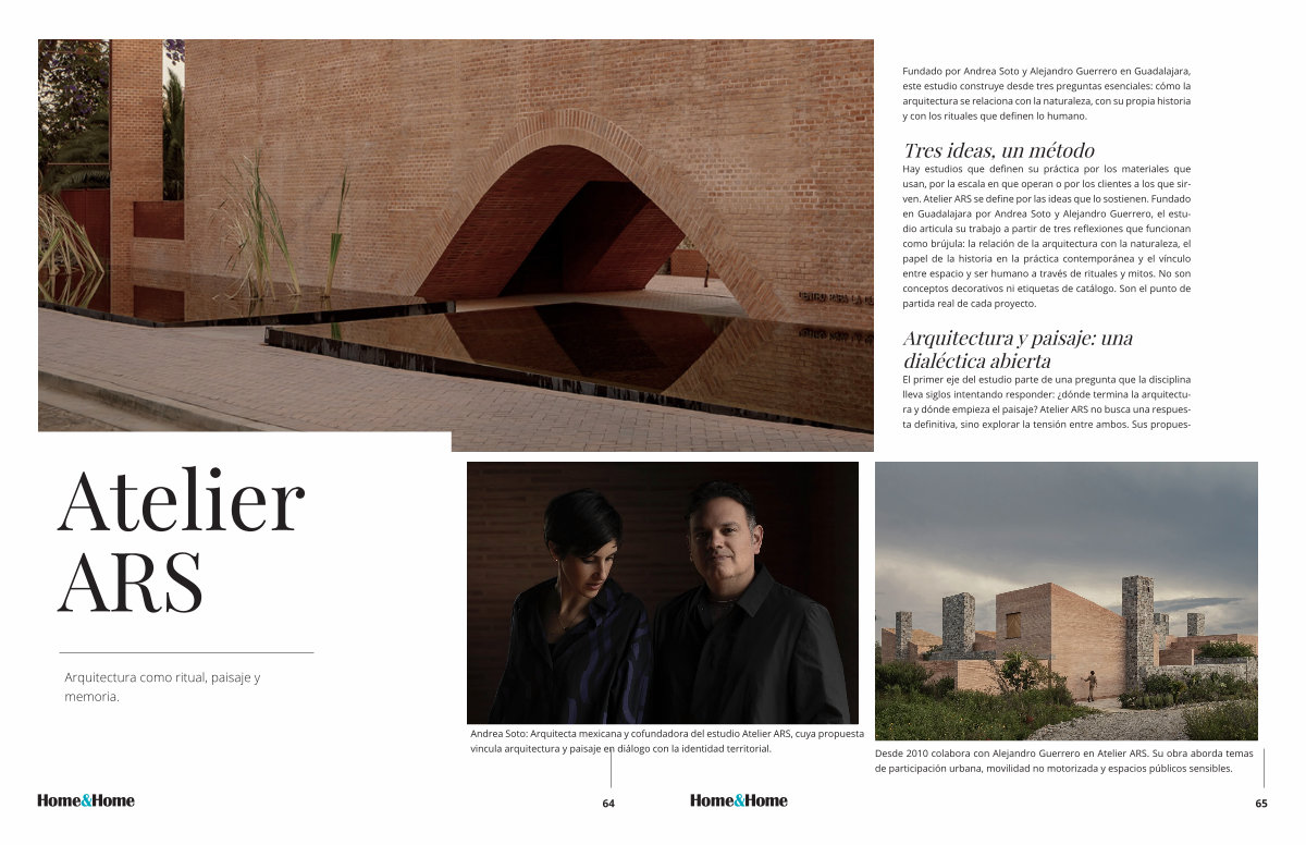 Hay estudios que definen su práctica por los materiales que usan, por la escala en que operan o por los clientes a los que sirven. Atelier ARS se define por las ideas que lo sostienen. Fundado en Guadalajara por Andrea Soto y Alejandro Guerrero, el estudio articula su trabajo a partir de tres reflexiones que funcionan como brújula: la relación de la arquitectura con la naturaleza, el papel de la historia en la práctica contemporánea y el vínculo entre espacio y ser humano a través de rituales y mitos. No son conceptos decorativos ni etiquetas de catálogo. Son el punto de partida real de cada proyecto.