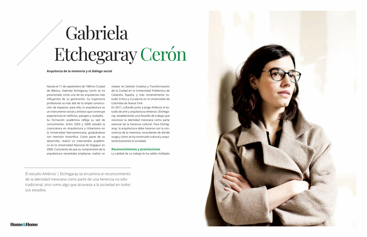 Nacida el 11 de septiembre de 1984 en Ciudad de México, Gabriela Etchegaray Cerón se ha posicionado como una de las arquitectas más influyentes de su generación. Su trayectoria profesional va más allá de la simple construcción de espacios; para ella, la arquitectura es un instrumento social y artístico que construye experiencias en edificios, paisajes y ciudades. Su formación académica refleja su sed de conocimiento. Entre 2003 y 2008 estudió la Licenciatura en Arquitectura y Urbanismo en la Universidad Iberoamericana, graduándose con mención honorífica. Como parte de su desarrollo, realizó un intercambio académico en la Universidad Nacional de Singapur en 2006. Consciente de que su comprensión de la arquitectura necesitaba ampliarse, realizó un máster en Gestión Creativa y Transformación de la Ciudad en la Universidad Politécnica de Cataluña, España, y más recientemente estudió Crítica y Curaduría en la Universidad de Columbia de Nueva York. En 2011, cofundó junto a Jorge Ambrosi el estudio de arte y arquitectura Ambrosi | Etchegaray, estableciendo una filosofía de trabajo que reconoce la identidad mexicana como parte esencial de la herencia cultural. Para Etchegaray, la arquitectura debe hacerse con la consciencia de la memoria, recordando de dónde surge y cómo se ha construido cultural y arquitectónicamente la sociedad.