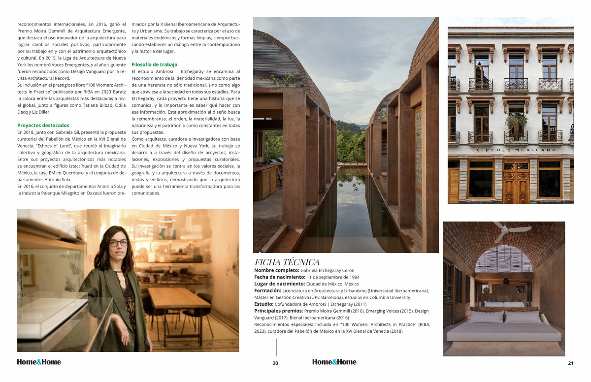 : Gabriela Etchegaray Cerón nto: 11 de septiembre de 1984 to: Ciudad de México, México atura en Arquitectura y Urbanismo( Universidad Iberoamericana), eativa( UPC Barcelona), estudios en Columbia University ra de Ambrosi | Etchegaray( 2011) os: Premio Moira Gemmill( 2016), Emerging Voices( 2015), Design nal Iberoamericana( 2016) peciales: Incluida en“ 100 Women: Architects in Practice”( RIBA, abellón de México en la XVI Bienal de Venecia( 2018)