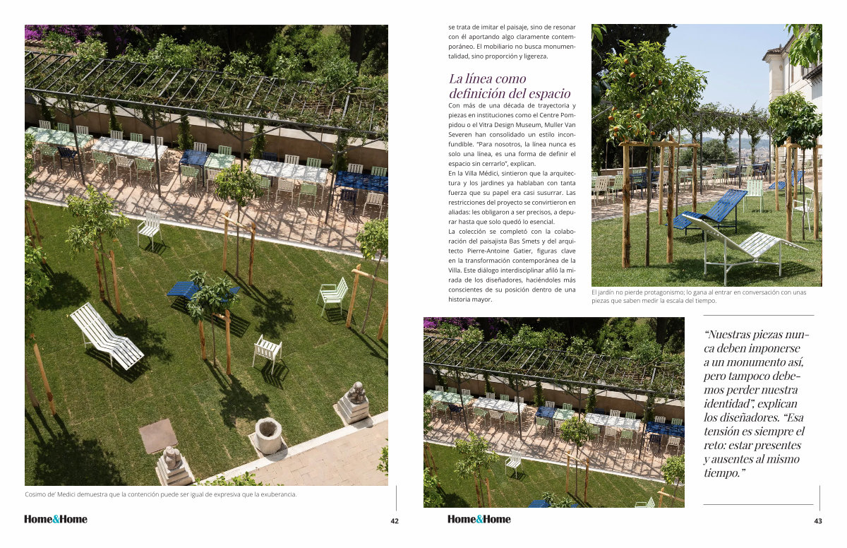 Con más de una década de trayectoria y piezas en instituciones como el Centre Pompidou o el Vitra Design Museum, Muller Van Severen han consolidado un estilo inconfundible.“ Para nosotros, la línea nunca es solo una línea, es una forma de definir el espacio sin cerrarlo”, explican. En la Villa Médici, sintieron que la arquitectura y los jardines ya hablaban con tanta fuerza que su papel era casi susurrar. Las restricciones del proyecto se convirtieron en aliadas: les obligaron a ser precisos, a depurar hasta que solo quedó lo esencial. La colección se completó con la colaboración del paisajista Bas Smets y del arquitecto Pierre-Antoine Gatier, figuras clave en la transformación contemporánea de la Villa. Este diálogo interdisciplinar afiló la mirada de los diseñadores, haciéndoles más conscientes de su posición dentro de una historia mayor.