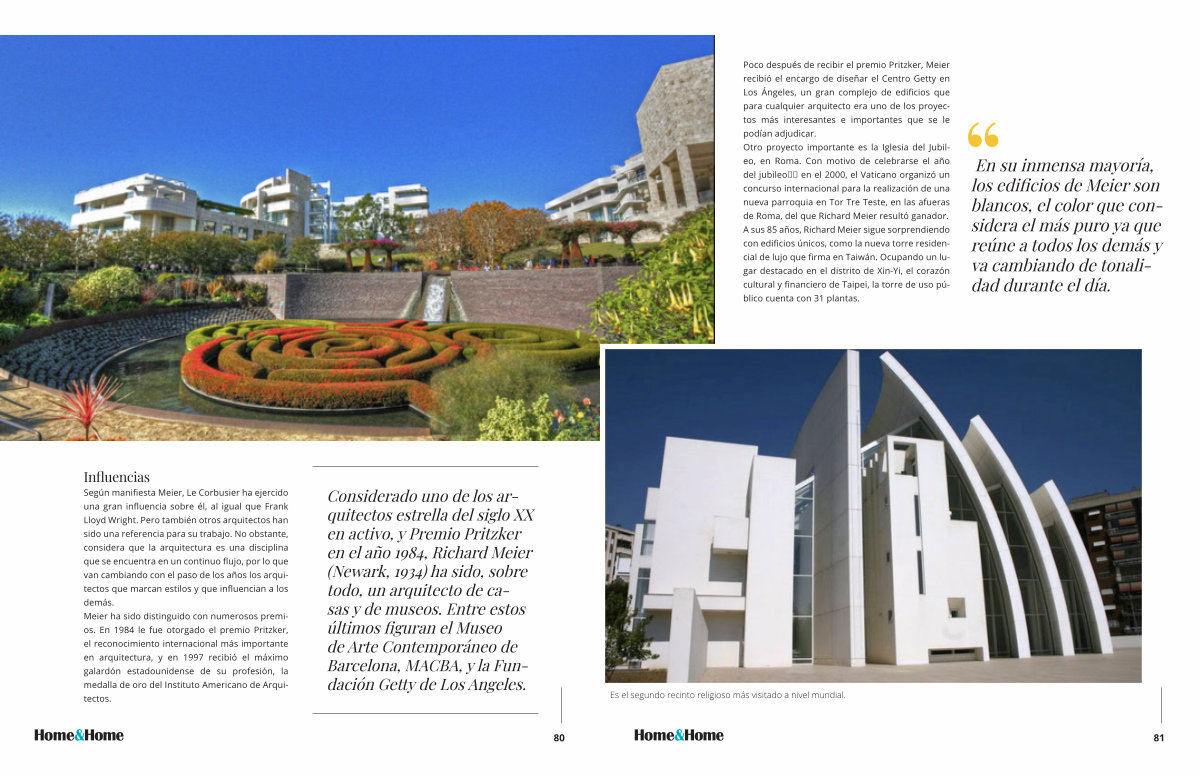 Según manifiesta Meier , Le Corbusier ha ejercido una gran influencia sobre él , al igual que Frank Lloyd Wright . Pero también otros arquitectos han sido una referencia para su trabajo . No obstante , considera que la arquitectura es una disciplina que se encuentra en un continuo flujo , por lo que van cambiando con el paso de los años los arquitectos que marcan estilos y que influencian a los demás . Meier ha sido distinguido con numerosos premios . En 1984 le fue otorgado el premio Pritzker , el reconocimiento internacional más importante en arquitectura , y en 1997 recibió el máximo galardón estadounidense de su profesión , la medalla de oro del Instituto Americano de Arquitectos .