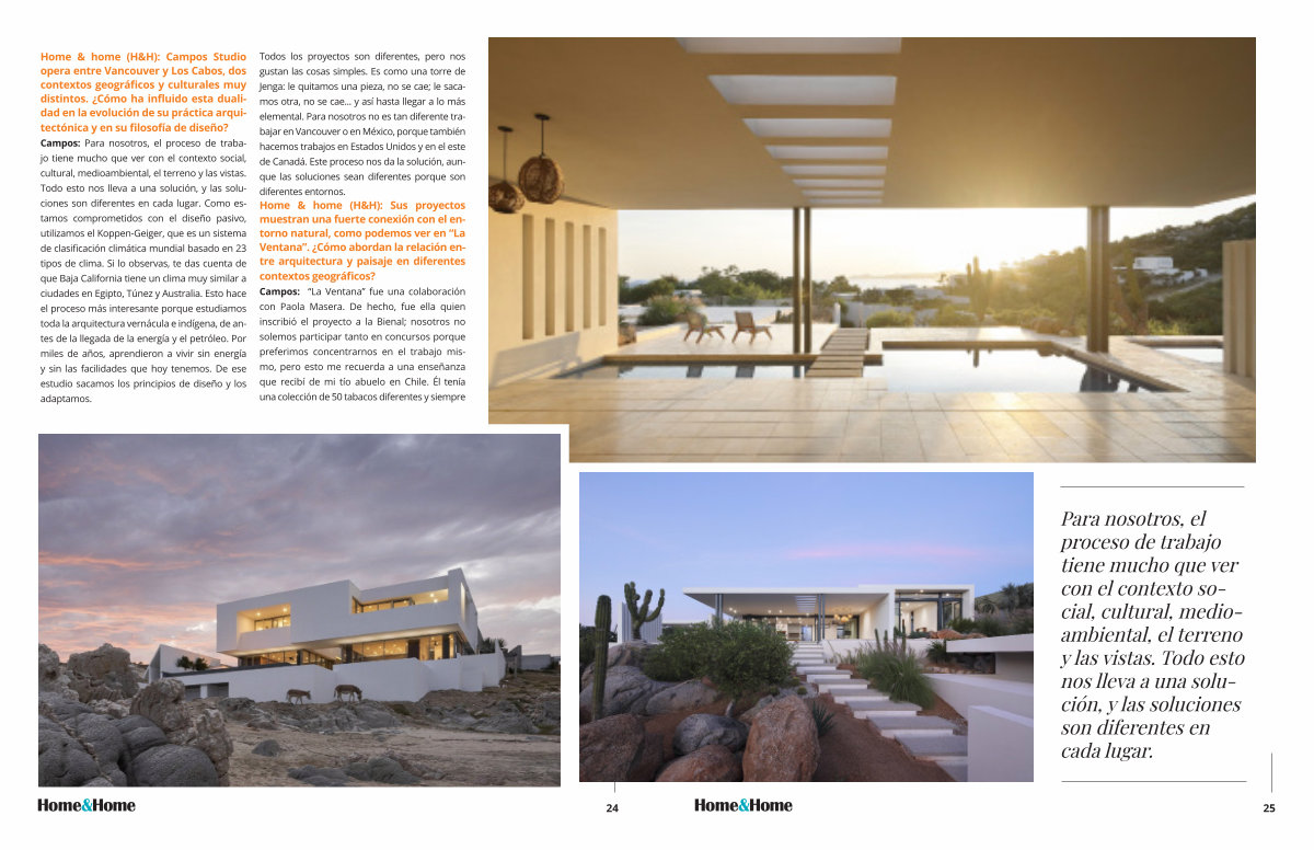 Todos los proyectos son diferentes, pero nos gustan las cosas simples. Es como una torre de Jenga: le quitamos una pieza, no se cae; le sacamos otra, no se cae... y así hasta llegar a lo más elemental. Para nosotros no es tan diferente trabajar en Vancouver o en México, porque también hacemos trabajos en Estados Unidos y en el este de Canadá. Este proceso nos da la solución, aunque las soluciones sean diferentes porque son diferentes entornos. Home & home( H & H): Sus proyectos muestran una fuerte conexión con el entorno natural, como podemos ver en“ La Ventana”. ¿ Cómo abordan la relación entre arquitectura y paisaje en diferentes contextos geográficos? Campos:“ La Ventana” fue una colaboración con Paola Masera. De hecho, fue ella quien inscribió el proyecto a la Bienal; nosotros no solemos participar tanto en concursos porque preferimos concentrarnos en el trabajo mismo, pero esto me recuerda a una enseñanza que recibí de mi tío abuelo en Chile. Él tenía una colección de 50 tabacos diferentes y siempre