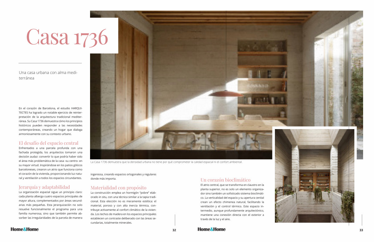 El atrio central, que se transforma en claustro en la planta superior, no es solo un elemento organizador sino también un sofisticado sistema bioclimático. La verticalidad del espacio y su apertura cenital crean un efecto chimenea natural, facilitando la ventilación y el control térmico. Este espacio intermedio, aunque profundamente arquitectónico, mantiene una conexión directa con el exterior a través de la luz y el aire.