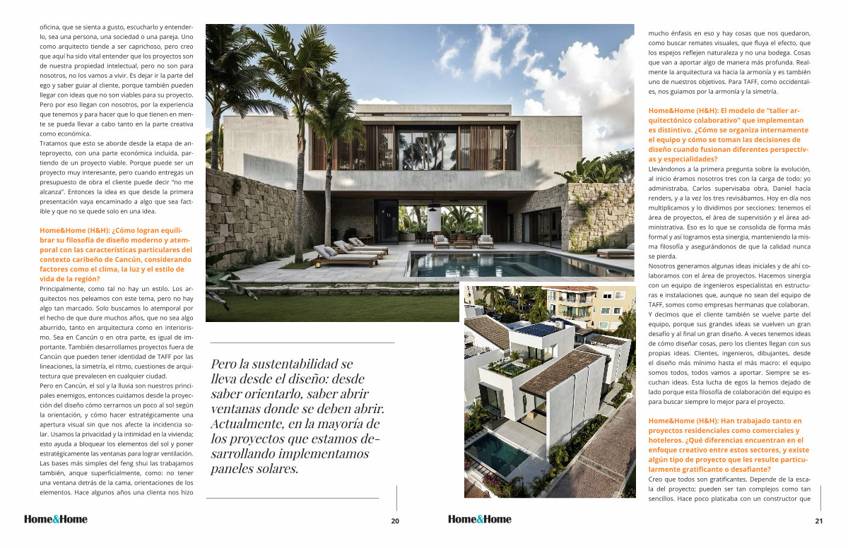 Home & Home( H & H): El modelo de“ taller arquitectónico colaborativo” que implementan es distintivo. ¿ Cómo se organiza internamente el equipo y cómo se toman las decisiones de diseño cuando fusionan diferentes perspectivas y especialidades? Llevándonos a la primera pregunta sobre la evolución, al inicio éramos nosotros tres con la carga de todo: yo administraba, Carlos supervisaba obra, Daniel hacía renders, y a la vez los tres revisábamos. Hoy en día nos multiplicamos y lo dividimos por secciones: tenemos el área de proyectos, el área de supervisión y el área administrativa. Eso es lo que se consolida de forma más formal y así logramos esta sinergia, manteniendo la misma filosofía y asegurándonos de que la calidad nunca se pierda. Nosotros generamos algunas ideas iniciales y de ahí colaboramos con el área de proyectos. Hacemos sinergia con un equipo de ingenieros especialistas en estructuras e instalaciones que, aunque no sean del equipo de TAFF, somos como empresas hermanas que colaboran. Y decimos que el cliente también se vuelve parte del equipo, porque sus grandes ideas se vuelven un gran desafío y al final un gran diseño. A veces tenemos ideas de cómo diseñar cosas, pero los clientes llegan con sus propias ideas. Clientes, ingenieros, dibujantes, desde el diseño más mínimo hasta el más macro: el equipo somos todos, todos vamos a aportar. Siempre se escuchan ideas. Esta lucha de egos la hemos dejado de lado porque esta filosofía de colaboración del equipo es para buscar siempre lo mejor para el proyecto.
