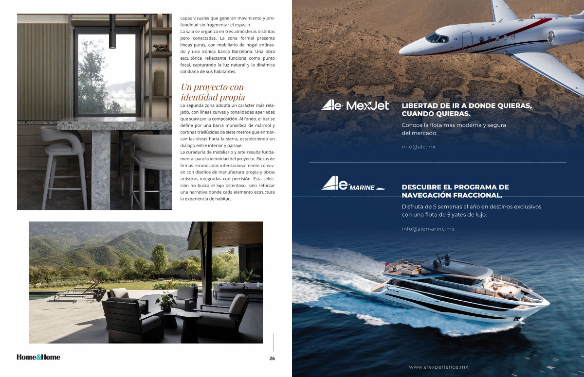 capas visuales que generan movimiento y profundidad sin fragmentar el espacio. La sala se organiza en tres atmósferas distintas pero conectadas. La zona formal presenta líneas puras, con mobiliario de nogal entintado y una icónica banca Barcelona. Una obra escultórica reflectante funciona como punto focal, capturando la luz natural y la dinámica cotidiana de sus habitantes.