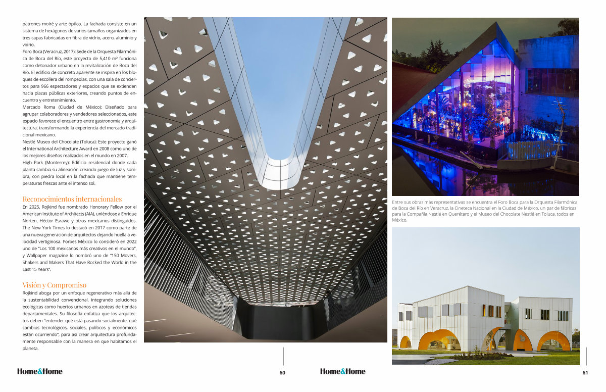 patrones moiré y arte óptico. La fachada consiste en un sistema de hexágonos de varios tamaños organizados en tres capas fabricadas en fibra de vidrio, acero, aluminio y vidrio. Foro Boca( Veracruz, 2017): Sede de la Orquesta Filarmónica de Boca del Río, este proyecto de 5,410 m ² funciona como detonador urbano en la revitalización de Boca del Río. El edificio de concreto aparente se inspira en los bloques de escollera del rompeolas, con una sala de conciertos para 966 espectadores y espacios que se extienden hacia plazas públicas exteriores, creando puntos de encuentro y entretenimiento. Mercado Roma( Ciudad de México): Diseñado para agrupar colaboradores y vendedores seleccionados, este espacio favorece el encuentro entre gastronomía y arquitectura, transformando la experiencia del mercado tradicional mexicano. Nestlé Museo del Chocolate( Toluca): Este proyecto ganó el International Architecture Award en 2008 como uno de los mejores diseños realizados en el mundo en 2007. High Park( Monterrey): Edificio residencial donde cada planta cambia su alineación creando juego de luz y sombra, con piedra local en la fachada que mantiene temperaturas frescas ante el intenso sol.