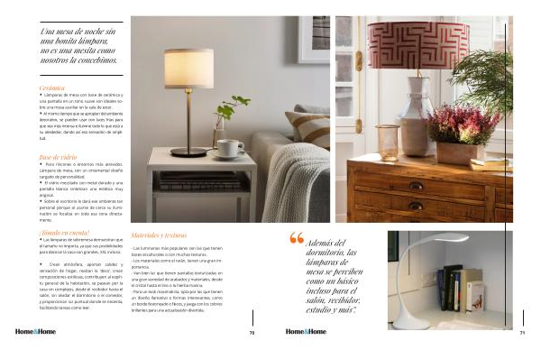 • Crean atmósfera , aportan calidez y sensación de hogar , realzan la ‘ deco ’, crean composiciones estilosas , contribuyen al espíritu general de la habitación , se pasean por la casa sin complejos , desde el recibidor hasta el salón , sin olvidar el dormitorio o el comedor , y proporcionan luz puntual donde se necesita , facilitando tareas como leer .
